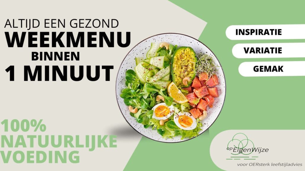 Met ‘Jouw-opEigenWijze-Weekmenu’ krijg je iedere week een samengesteld menu met gezonde, natuurlijke recepten.