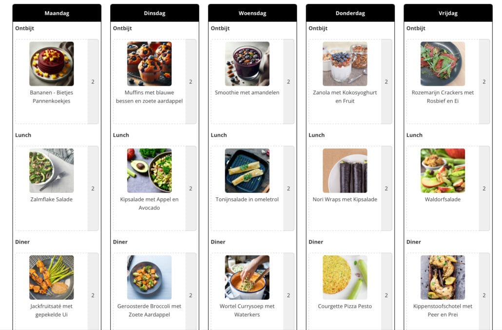 Je ontvang iedere week een nieuw menu met recepten voor 5 dagen. Voor ontbijt, lunch en diner